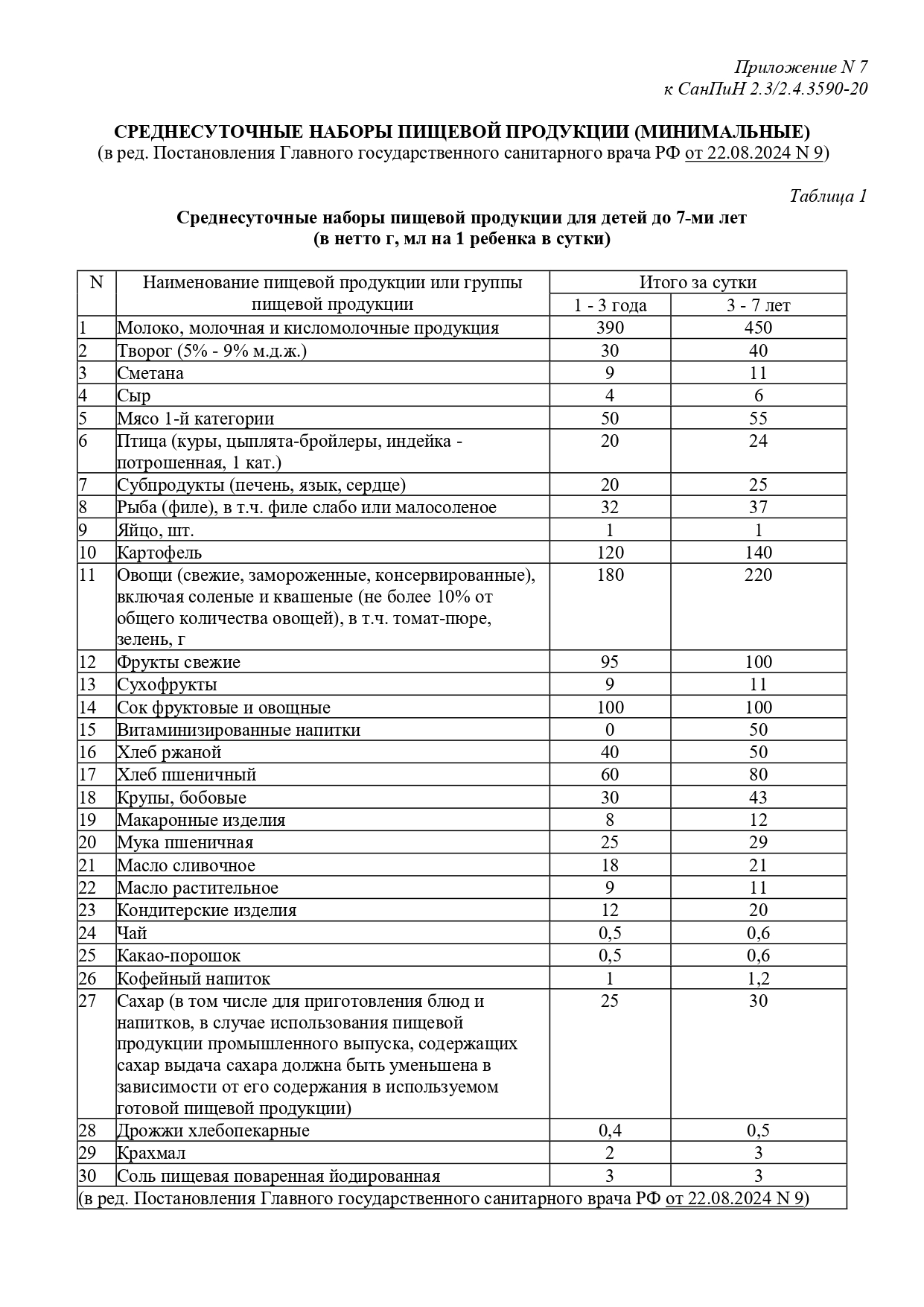 Среднесуточные наборы пищевой продукции для детей до 7-ми лет (в нетто г, мл на 1 ребенка в сутки)